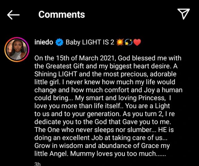 The popular Nigerian actress, brand ambassador, social media Influencer, model, and entrepreneur who goes by the name Ini Edo has caused massive reactions on social media after she took to her verified Instagram page hours ago and shared a photo of herself and her daughter as she turns 2 Years today. While she was sharing the photos on Instagram she wrote a caption that says” Baby Delight is two.” Take a look at the photo alongside the screenshot of the caption below