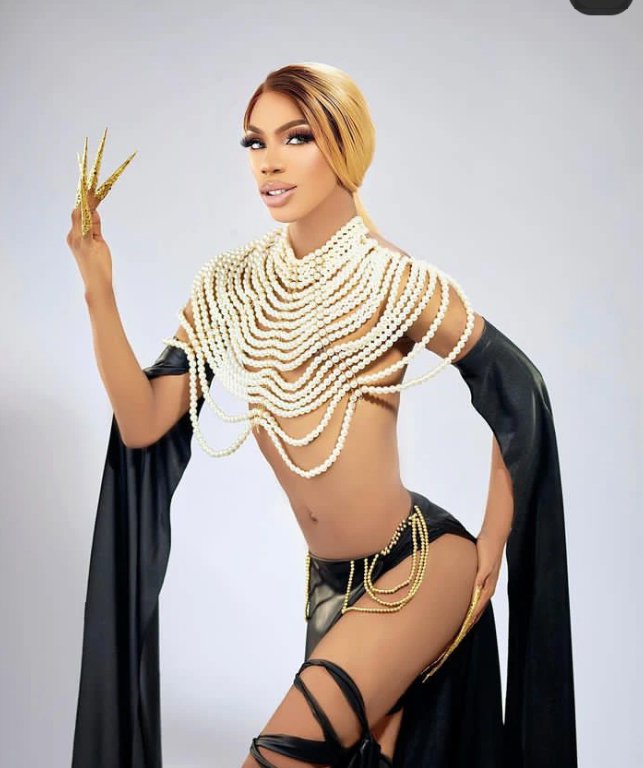 The crossdresser now actor took to Instagram this morning to share photos that show him putting on a dress that is uniquely designed. There is no top but beats were used to cover his shoulder down to the middle of his stomach. The black material was used to design the one he wore from his waist down to his legs.