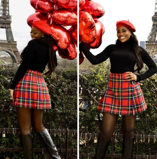This time, she showed up in a black outfit and a skirt that looked good on her. She applied neatly done makeup to her face that matched the color of her skin. She put on black boots with a beret cap that looked nice on her.