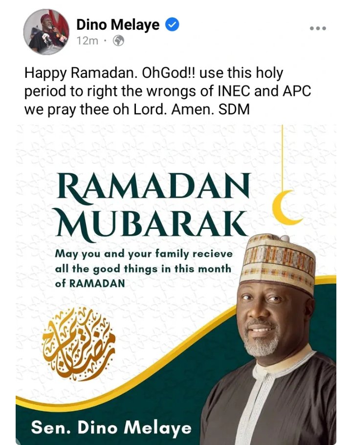 According to what he wrote, “Happy Ramadan. Oh God!! use this holy period to right the wrongs of INEC and APC we pray thee oh Lord. Amen. SDM